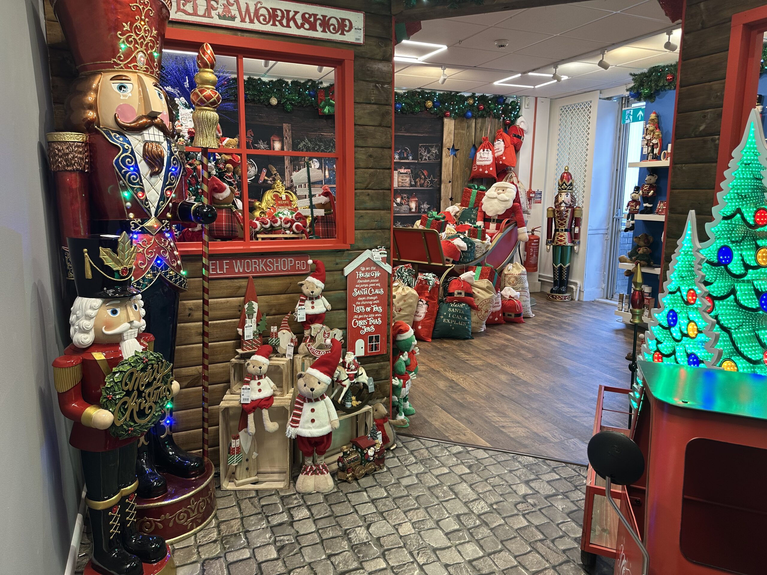 Work benches overflow with teddy bears, nutcrackers and rocking horses, while conveyor belts carry toys through the workshop. Elves dressed in bright green and red uniforms add the final finishing touches, ensuring every gift is ready for Christmas Eve.